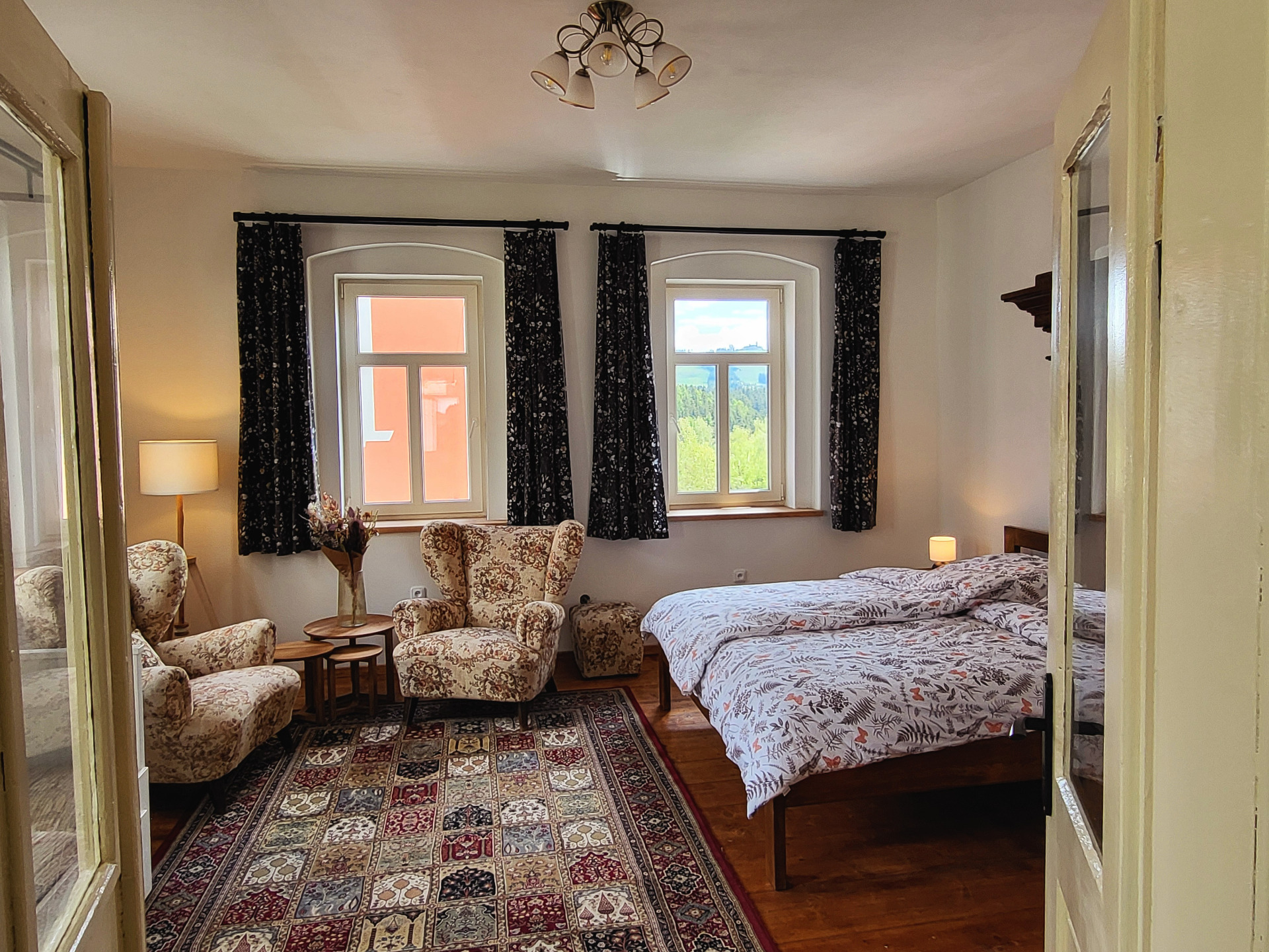 - Wohnzimmer (24 m²) – breites Doppelbett (180 cm), ausziehbares Bett für zwei Personen (160 cm), Kleiderschrank, bequeme Sessel für zwei Personen mit Couchtisch, TV mit Internetverbindung